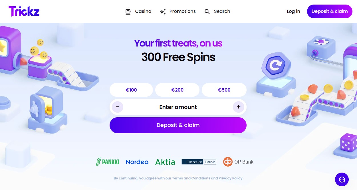 Trickz sitt lekne casinotema møter deg idet siden åpner. Fargerike kort mot lys bakgrunn med myke gradienter. På mobil ligger knappene der tomlene vil ha dem. Merket prioriterer rask underholdning fremfor tung “krom”. Du scroller noen rader og er allerede i ferd med å velge en spilleautomat. Sport er ikke hovedfokus, men casinorutenettet og live-rommene har samme rene uttrykk overalt. Mange anmeldere kaller Trickz et Finland-orientert Pay N Play-nettsted, noe som forklarer raske overganger og minimalistiske flyter.